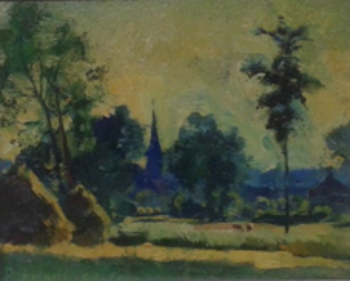 Leon Pringels, kerkje in het groene veld, 26 x 22 cm, olieverf op paneel.