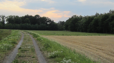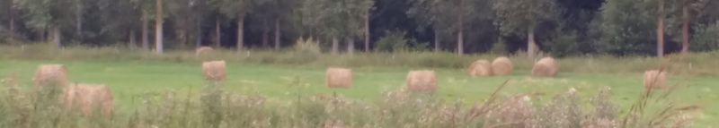 gestapelde hooi-balen geven - als een uit de kluiten gewassen monument, gelijkend op een oninneembare burcht - invulling aan een leeg, gemaaid (koren?)veld.
